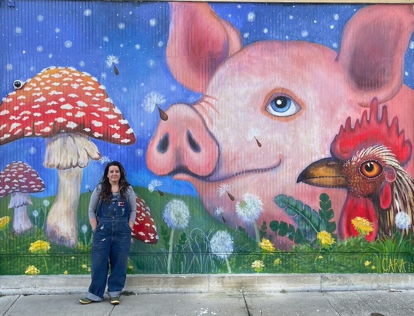 I did a lot of mural work in California and used to have a business there and in New Mexico doing interior painted murals for homeowners. I applied to do a mural for the “Let It Shine!” program, and the owner of the building was interested in a design with a pig or rooster, which suited my technique and the themes I like.
