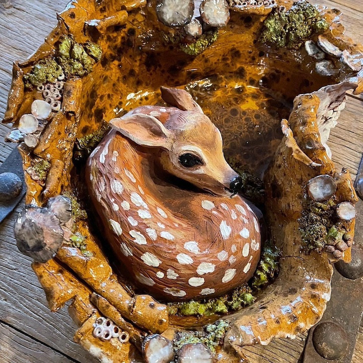 I like to describe my art as a “love letter to nature.” I started off as a painter and moved to sculptural art in the last four to five years. I like to try everything: jewelry making, stone sculpting, fiber arts, glasswork.
