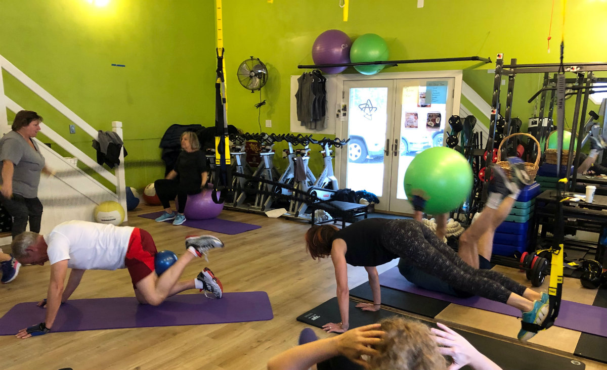 I’ve always exercised — I loved tennis when I was in high school and as an adult always ran, even doing marathons. After I retired, I started going to the gym and got my training certification. I was teaching classes there, and when the gym was sold at the end of 2016 my husband and I started transforming our garage into a studio so I could do personal training. That turned into small group training, and then I bought some spin bikes a friend-of-a-friend was selling. The classes kept evolving from there. Now we offer spin, boxing, total body conditioning, yoga and other classes.