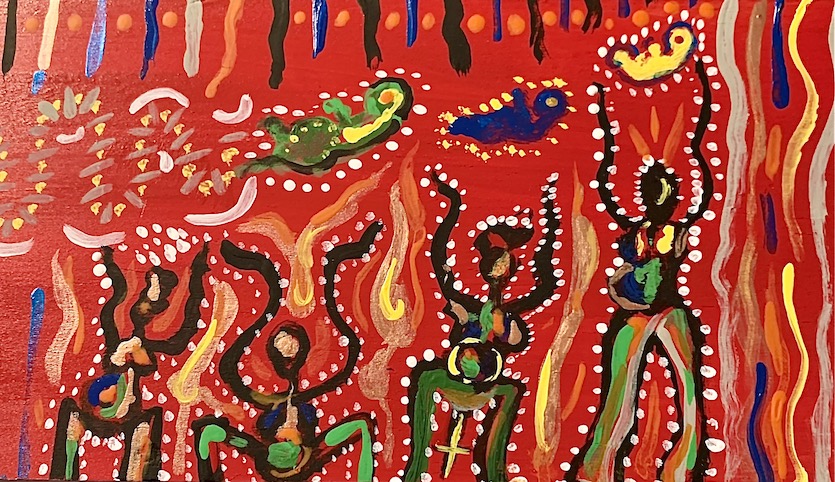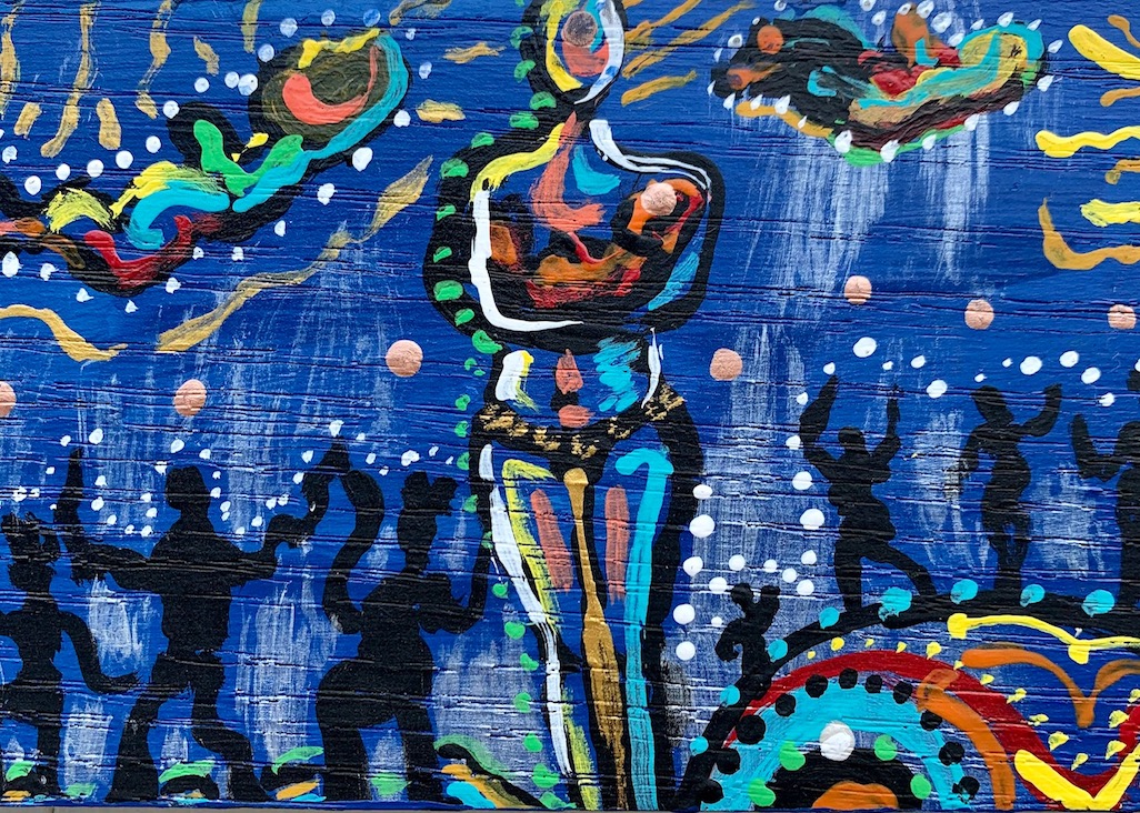 I’m excited to have my first solo art exhibit. I couldn’t ever have imagined it, and for it to be happening in Hudson makes it even more special. The entire exhibition includes 12 pieces, with two of the large canvases being in the window. On display inside are 12”x16” storyboards on consolidated wooden planks. I like using wood because it’s natural, and represents something old and something natural, like giving birth. Some of the images look like hieroglyphics and are very primitive.