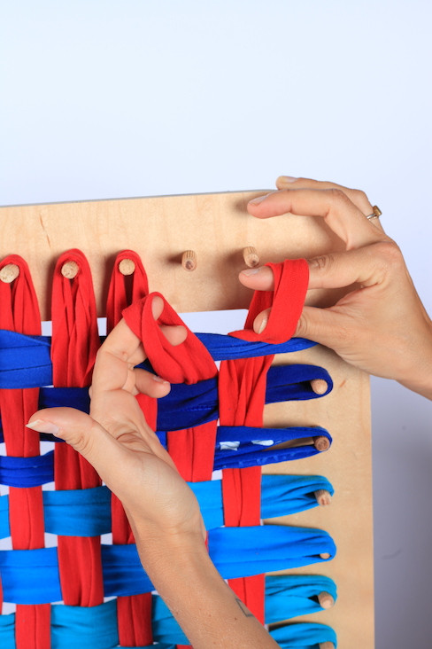 We developed a t-shirt waste weaving manual so others can use their own discarded t-shirts and bring new function to textile waste. We scaled the potholder loom method up and developed a DIY book. You cut t-shirts horizontally to make a loop and weave them on the loom similar to the old potholder loom. People can purchase or make their own looms. We did a training program with The Spark of Hudson and one with stay-at-home moms. These groups started producing weighted blankets and other projects out of t-shirt loom panels.