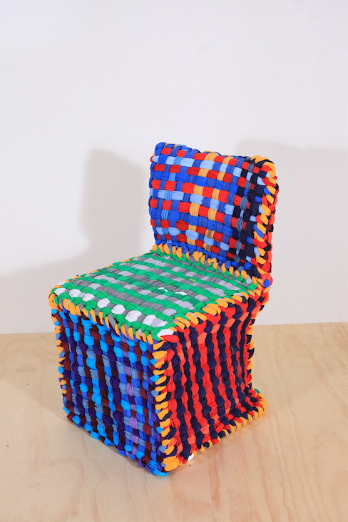 The store has multiple collections of things. Our face mirrors, one of our iconic symbols, are made of 80% recycled ranger board and painted in fun colors. Our blue denim chairs are made primarily of recycled material and industrial paper tubing. The side tables use excess material from plywood we use to manufacture our t-shirt looms. They’re flat packed and easy to assemble, allowing people to take them with them when they move. We want DIY to be more accessible to people.