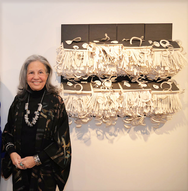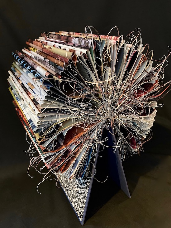 I’ve painted and for many years made large fiber and paper sculptures, but in 2007 I had a “eureka moment” and combined my need to recycle things with my love of books. I use books that otherwise might be discarded and transform them into artworks; they become the raw material to form sculptures. The books are often painted, distressed, and cut, sometimes into slivers which curl and undulate, and return to the tree-like shape from which the paper was made. Some books explode from their spines: a four-inch book has grown to 24 inches through a series of cuts and spirals reaching out to the viewer with subliminal messages.