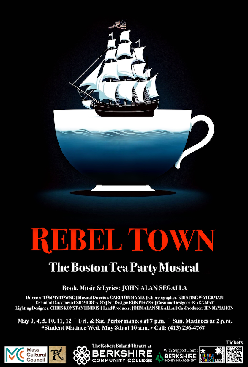 History buffs and those who love musicals will be interested in knowing that Berkshire native John Segalla has written the book, music and lyrics for “Rebel Town: The Boston Tea Party Musical.” The full production will premiere at the Robert Boland Theatre at Berkshire Community College May 3-11, and will feature BCC students and a cast of local professional actors, musicians, alumni and community members. It tells the story of a young boy and his real-life involvement in the Boston Tea Party. Segalla, an actor and singer, describes the show as “1776 “ meets “Guys and Dolls."