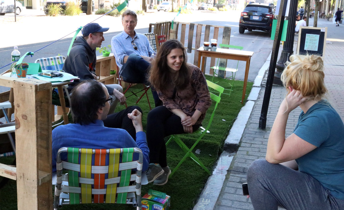 That’s why I did the parklet project: to get people to hang out and say 'hi.' I did it on PARK(ing) Day, an international movement that takes place on the third week in September. I went to a parking spot on North Street, paid the meter for the whole day (I had the receipt, just in case). I put artificial turf rolls from The Home Depot on the ground, found some wooden pallets, and made a fence to create a barrier around the parking space. I also brought lawn chairs, some folding tables and potted plants.