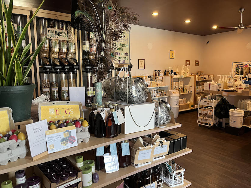 The center carries a lot of awesome goods — cleaning and body care products, coffee and tea, nuts, rice, and beans, much of it from local providers. There are also reusable containers for sale. We’re trying to work with brands that are closed-loop, where we can ship the box back. We’re mindful on how companies package their goods, and that impacts our decision on what we sell.