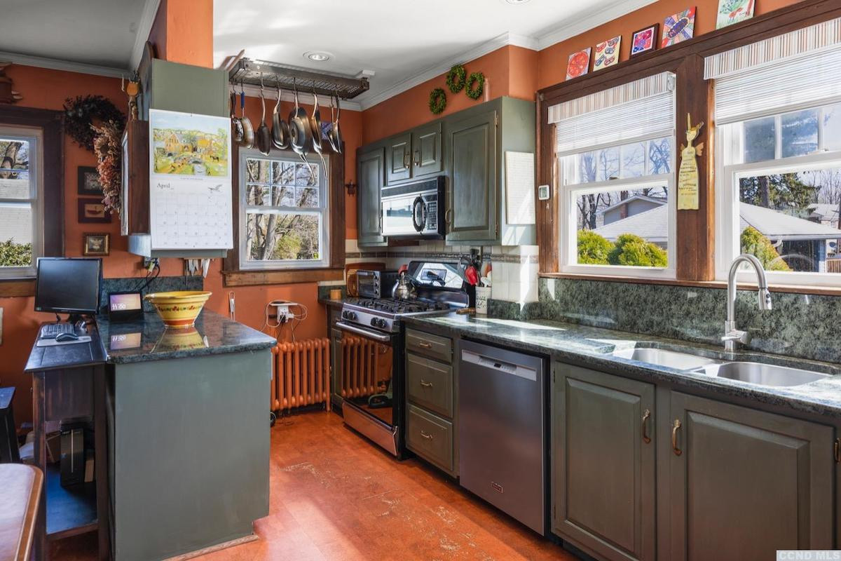 Formerly known as The Sciutto House and built in 1935, this Arts and Crafts home in Clavarack retains original woodwork details, including built-in cabinetry and radiator covers. There are three bedrooms and one bathroom in 2,500 square feet. The main level has a modern eat-in kitchen, formal dining room, sunroom and more. The basement is partially finished and features a wine cellar. The property has a two-car garage. Listed at $475,000 by Coldwell Banker Advisor Realty.
