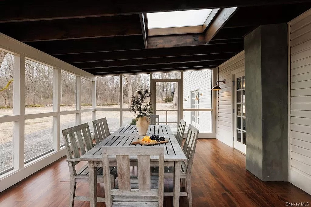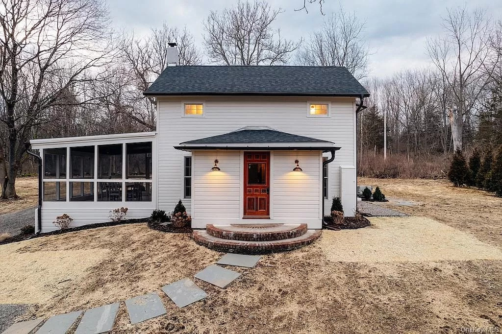 This Upstate Down creation in Rhinebeck offers four bedrooms and three bathrooms on a one-acre lot. It features an open layout with large windows and French doors, a high-end kitchen, and a large screened porch. The light-filled living room includes a stone fireplace and access to a library/den. Listed at $945,000 by Upstate Down.