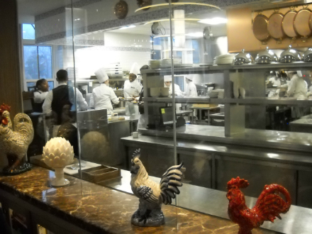Bocuse at the Culinary does a good job of making you feel as if you've been transported to Taillevent in the eighth arondissement. The entryway winds past a wall of French vintages with breathtaking prices. The waitstaff is clad in butcher’s aprons with vests and neckties. The knife and spoon are real silver and of formidable heft, and the oversized napkins are Frette. But there are no tablecloths. (An environmental consideration, says Dr. Ryan, in deference to the gallons of detergent not used). There are extravagant flower arrangements throughout, alongside the fleet of ceramic roosters, traditional icons in French restaurants. The flacon of off-white salt on your table is said to be pre-historic and mined in the Himalayas. The dishes of the main course are delivered flamboyantly under silver domes… quiet a spectacle when four diners are served at once. One dining room wall is a glass storefront displaying stainless steel stoves, copper pots, and student chefs and instructors in towering toque blanche at work. A bow to modern technology: the leather-encased wine list is not a book, but an iPad offering a hundred or so wines; I tried a $6 glass of a Drouhin Chardonnay that drank as if it were a $20 one. The meal preface is an amuse bouche, a tidbit to “amuse the mouth" -- in this case a postage stamp-sized ravioli in truffle sauce. The main courses are tiny, displayed like origami on hubcap-sized plates.