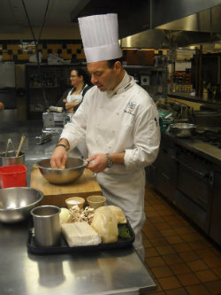 You are split into teams, and each team is assigned a different part of the meal. Which could be a disaster unless the chef in charge plays a strong hand with each group, which was the case with Chef DelleRose (at left), a Bronx native whose dad owned a butcher shop where as a kid he “cooked and ate." A 1994 Culinary Institute graduate, he was executive chef at several blue chip restaurants before returning to Hyde Park to teach. After the mandatory “watch the sharp knives and hot stoves" lecture, he showed us how to make mozzarella from scratch using milk, something acid, and salt. Lots of salt. (“Hey chef, what’s your blood pressure?") A purist would say the mozzarella isn’t authentic because it comes from milk, and not Italian water buffalo, but have you looked at the ingredients on your supermarket cheese lately? I don’t think there are any water buffalo in Wisconsin. And what DelleRose produced, in a few minutes of boiling curd in a pot of salt water, wasn’t the rock hard brick you get in the deli, but a soft, stringy, delicious, and salty cheese. As scooped from the pot, it was softer than Jello and clung to the spoon.