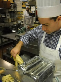 We then began making pasta dough and running it through a machine that looked like it had been there since the site was a Jesuit seminary, to make linguini. Some advice from DelleRose: Don’t cook pasta with olive oil in the water and don't cook it al dente because you want it to absorb the flavor of the sauce. And then there was the risotto, helped along by water that had been cured by mushrooms soaking in it for hours. At this point, teams were assembled and assigned tasks. My team included a husband and wife from New Jersey, John and Diana Tully, who normally toil on Wall Street. Our assignments were what Chef DelleRose called “hunter-style chicken" (usually labeled on restaurant menus as chicken cacciatore), tagliatelle Bolognese (a meat sauce in the style of the city of Bologna), and a salad of oranges, fennel and Belgian endive. I won high praise for my pasta dough, though DelleRose insists he wasn’t tipped off that I was writing about my lesson, and I cheated by letting my teammates do most of the work while I wandered around observing the other stations at work on Sicilian tuna steaks, gnocchi, veal saltimbocca, and pizza with that special mozzarella made earlier, where I learned that pizza dough is different from pasta dough and the secret of great pizza is a VERY HOT oven.