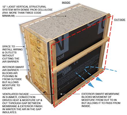 By Rona Easton and Lonn Combs “As I get older, I’m trying to simplify things,” our client has said, and that sentiment informs everything we do as architects. As the house framing quickly goes up, our focus turns to walls and the challenge of this mantra of simplicity within the complexities of construction. Walls are a lot more complicated than you may think. Of course, they provide shelter and enclosure, but now they do a whole lot more and so they’ve had to step up their game and get really smart. As mediators between the outside environment and our heavily controlled interiors, walls need to multitask like never before, while also being aware of what is required of them in different seasons and climates, and being able to behave accordingly. The rules of the game changed even further with the advent of airtight, heavily insulated buildings designed to stop the escape of energy. With thicker insulation, moisture moves through more slowly and the air tightness closes down the escape routes. Controlling moisture and preventing mold buildup is the fundamental challenge of our new, high-performance walls.