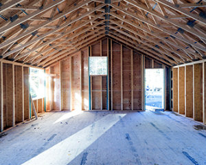 Left: Garage/studio building. Right: Interior of the studio. The I-joist system is also very builder and engineer friendly. Jason Smith of Frame to Finish, the sub-contractor to our GC, Little Deer Construction, loves this wall. With considerable expertise in traditional and advanced framing, he was thrilled with the ease and speed of erection, and the straightness and stability of the frame. There was no need for him to provide the usual temporary bracing to prevent the frame from buckling. Our structural engineer, Chad Lindberg of Taconic Engineering, loves the structural efficiency of the I-joists as wall studs, and the creative solutions this allows him.