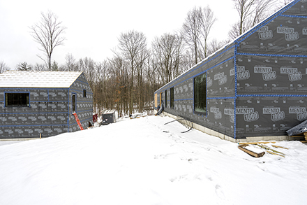 The interior wrap has been installed. As part of the wall assembly the wrap will control moisture movement through the wall — in both directions — making sure none is trapped in the wall.