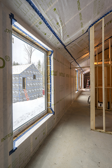 The interior is beginning to take shape while the installation of the windows proceeds. The interior wrap has been attached to the building frame and taped, and the cellulose insulation will be installed soon. (Cellulose is one of the oldest types of insulation — a fill that is blown into the wall, rather than laid in like a blanket. Modern cellulose is made from recycled newspaper, treated with a fire retardant and a non-toxic chemical that repels insects.)