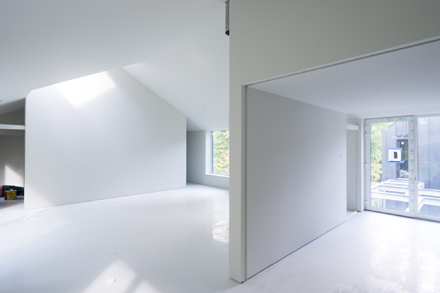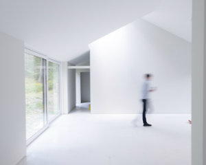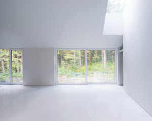 Interior view of the main living space with large glazed sliding doors; interior view of the main living space, with skylight and view to woods through glazed sliding doors.