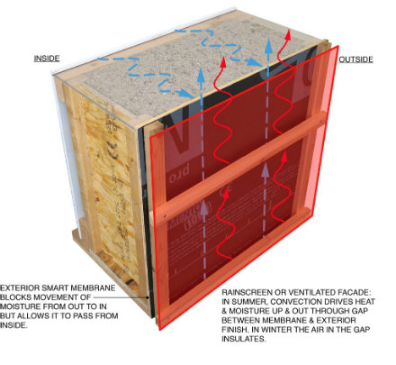 If you read our previous installment in this series on the Smart Wall, you will remember how the so-called rain screen, or ventilated facade, plays a critical role in the environmental performance of the house. As we said, controlling moisture and preventing mold build up is the fundamental challenge of our new, high performance walls. An exterior rain screen — a ventilation space between the wall sheathing and exterior finish — is one of the keys.