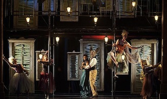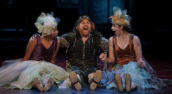 Music is everywhere in this production, from the Rude Mechanicals forming a crack band to express their sadness at the disappearance of their compatriot Bottom, to a stomping rendition of “I’ll Fly Away" that begins in the theater lobby. Composer and musical director Alex Sovronsky (who is also onstage as Snug) does much to evoke the sound of New Orleans jazz, and Barbara Allen’s choreography helps turn Theseus’s court into a debauched ballroom. Dangling Spanish moss and curling tree limbs overlap with man-made light fixtures in Travis George’s set design, creating a sense of the creeping influence of the mysterious woods not far from the orderly court. Period-appropriate costumes designed by Deborah A. Brothers work in harmony with Simotes’ vision. Simotes, of course, knows from Midsummer; he played Puck in S&Co.’s first-ever production, on the lawn of The Mount back in 1978. And the play has continued to loom large in the history of the company — though this is only its second turn indoors at the Tina Packer Playhouse (nee Founders’ Theatre), following a 2007 version that felt a little “off-brand," featuring several company newcomers who have not been heard from since.