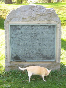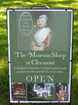 Margaret Beekman Livington, of the "welcoming" steely gaze; Pancho sniffs out the landmark sign Last weekend the new gift shop at the Clermont State Historic Site in southern Columbia County opened. I was bicycling past on my way to Tivoli to get the papers (with Pancho crammed in the basket), when a new sign grabbed me. Must’ve been something in Margaret Beekman Livingston’s steely gaze that drew me down the driveway to the site and into the new shop. Only the prospect of an unknown shop could get me down a hill that steep on two self-propelled wheels, knowing that getting back up would be hell, given the extra 14 pounds of dead weight in the basket, looking soulfully back at me, while I grunt.