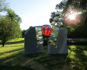 Exhibiting glass artist Richard Jolley and Julia Ricketts; hot air balloons seen through the frame of William Carlson's Vitro Muralis.