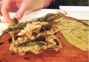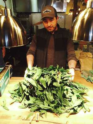 Last summer while building out the restaurant, Chef Kouri [above] and Van Beusichem (who did the bulk of the construction) needed a break, so they went swimming at a local watering hole. They stumbled upon a ramp “goldmine” and harvested enough to get through the summer season. This year they have already been back to their secret spot and have foraged around 10 pounds so far. They are featuring a weekly ramp specials. My advice: get there early. The ramp pesto was sold out by the time we got there, but we did get our fill with a dish called Ramps on Ramps, [below] which was ramp tempura with a ramp aioli served on a sliced log plate. Simple yet so fresh and flavorful. “There is nothing like an early season ramps — they are just so fresh and not abrasive.” says Von Beusichem. Chef Kouri would like to preserve and pickle enough to get them through the winter and he wants to incorporate ramp kimchi, pickled ramps, pesto and purees into future offerings.