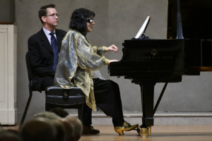 Delaney turning pages for pianist Mitsuko Uchida.