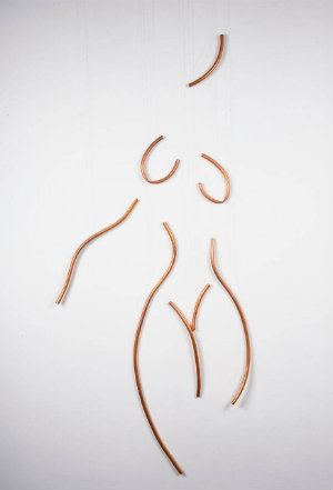 I moved back to Litchfield County because I wanted more balance in my life. I rented space at the Switch Factory in Bantam and started creating works, but with more time and dedication. Eventually I had to make a living again, so I started another personal training and yoga business. In my artistic life, I was moving toward sculpture, and later found studio and gallery space in Torrington, right across from the Warner Theatre. I’ve always been drawn to organic things — wood, driftwood, things found in nature. I like the shiny brightness of copper and then distressing it with acids, and juxtaposing it with driftwood. I also like corroded metal things — I get a lot of my materials from Home Depot! More recently I’ve started working with acrylic, which is bright and shiny, the opposite of organic. For instance, I’ll pair antlers and plexiglass pieces — the natural with the opposite. My work comes from emotion, feeling and experience, and the conflicts between pain and beauty. There is so much beauty in the female form. My background in physical therapy is an influence. I’m drawn to reimagining nudes in all kinds of incarnations and shapes. Rarely are they symmetrical, because humans aren’t symmetrical.
