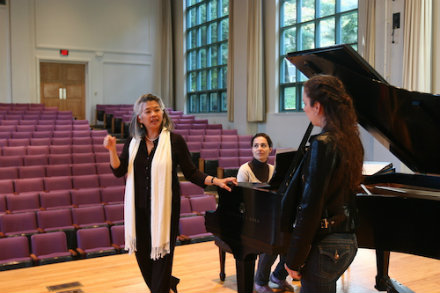 Kayo Iwama coaching Szilvia Mikó, pianist, and Sara LeMesh, mezzo.