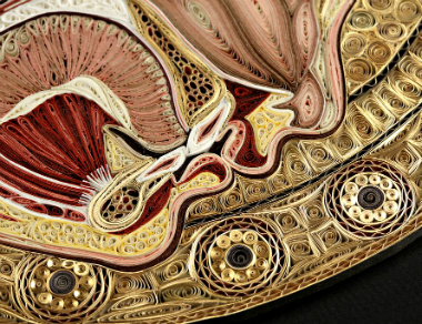 I began working with quilling in 2009 when I first started experimenting with it as a medium to use in the boxes I was making. I wanted to shift from depicting objects in my paintings to using objects, and boxes allowed me to shift materials often. A friend of mine knew I liked science and medical imagery and she sent me an illustration she thought I would like. I had intended to make a representation of it to use in a box but it grew too large and became a stand-alone piece. From there I started doing image searches for anatomy illustrations, and over the next five or six years I made two bodies of work that were focused only on anatomy. There was a gallery in New York City, the Pavel Zoubok Gallery, that I had been approaching with my work for 10 years, but when my quillwork began getting more press, I was more confident in approaching them with those pieces. Finally the gallery owner said yes, and ended up selling all of my anatomical pieces.