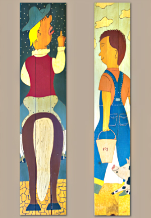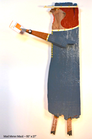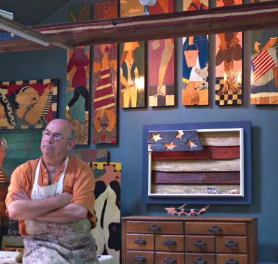 In the city, if there was a car accident, I’d run out and get the big pieces of glass from the street. Recently, I took the caution tape they’d left from an accident right outside my studio. We like to recycle. Now that I’m up here full time, it’s nice to have everything in one place. I figure I’ve sold about 100 pieces so far, so I’ve still got about 400. There are 18 in the show: some of the boards from the ‘90s, 5 wooden sculptures and a couple that go back 40 years. There are a lot of faces and people, and then some flying pigs and cows. Rick and I were in the PantoLoons for 11 years, and we had a great time. It’s a spectacular group of people, including some very talented NYC transplants, and it was a really nice experience for us. I’ve always stayed busy and had lots of interests. I’m a Gemini and they do everything. I’m not afraid to start something new.