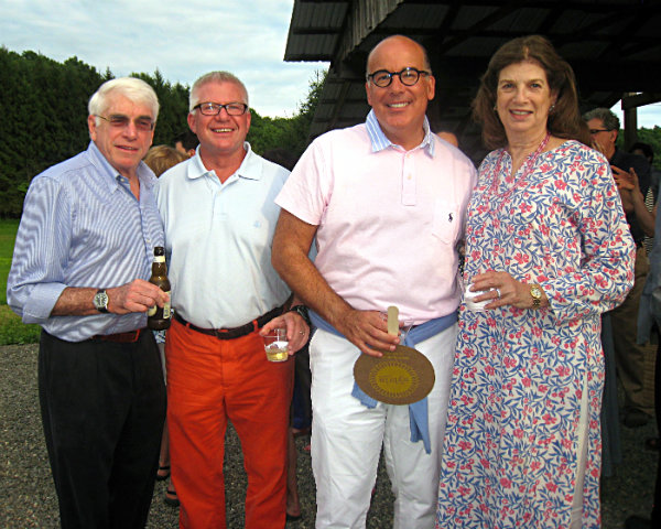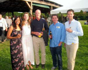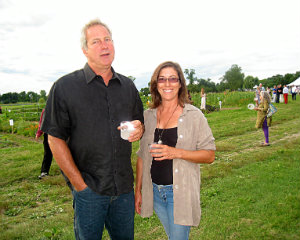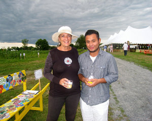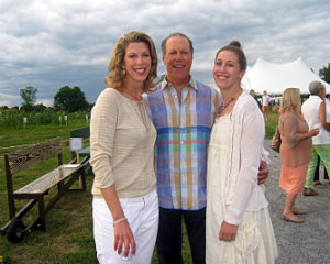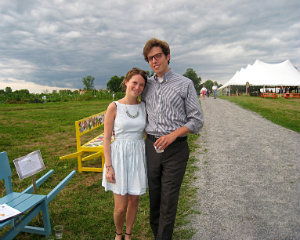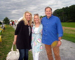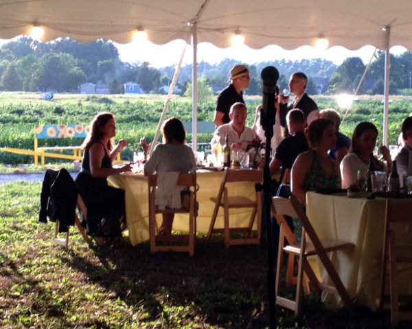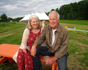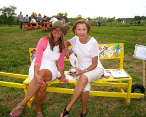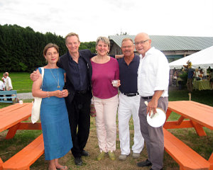 Lisa Green reports from Kinderhook. It’s pure brilliance for The Sylvia Center to hold its annual farm-to-table benefit dinner right at Katchkie Farm. On Saturday, July 19, approximately 330 supporters got a taste of the center’s mission: to inspire children to eat well through hands-on learning experiences on the farm. The party was hosted by Liz Neumark’s Great Performances catering company, which owns Katchkie Farm and The Sylvia Center. Guests enjoyed hors d’oeuvres prepared at the Tartinery Station and strolled about the fields planted with fruit, vegetables, herbs and flowers. At long tables under a tent, they feasted on items made from Hudson Valley products. A live auction offered jam and pickle sessions for six with master chefs, and the silent auction featured Dutch-inspired wheelbarrow benches, each festooned with its own decorative details. Funds will help bring students to Katchkie Farm to participate in The Sylvia Center’s programs both in Columbia County and New York City. Many of the kids have never seen food growing, and at their day at the farm, they can hold a chicken, take a tasting tour, harvest produce and work with the chefs — activities many of the adults at the tables agreed they’d love to do, too. Shown above, Anna Hammond, executive director of The Sylvia Center, Actor Bill Irwin,Linda Abbey of Great Performances, and Bob Mihalik and Les Newman of Botanica Floral and Event Design.
