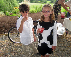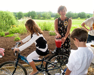 Claude Levy-Carrick watches his sister Hannah Levy-Carrick power up the blender by pedaling the bicycle as Nina Simmons, chef instructor at The Sylvia Center, encourages her to go for speed; Claude and Hannah enjoy the smoothie fruits of their labor.
