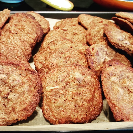 I wrote this week’s article for purely selfish reasons. I wanted to memorialize the best chocolate chip cookie recipe on earth. That’s saying a lot. And I mean it. For years I have tinkered and tailored recipes to come up with my version of the perfect chocolate chip cookie: thin with lacey and crispy edges, a soft gooey center, studded with extra chocolately chocolate chips, overflowing with chocolate flavor and with a definitive crunch from a spattering of nuts. This quest of mine proved to be some version of the Holy Grail. For all of my trying I never got it right. The famous Toll House cookie is too cakey and fat. Other versions combined different fats and did not deliver the rich buttery taste I also crave. And finally, most chocolate chips are not chocolatey enough for me. And then, last week, I made a determination that this was it — I was going to master a chocolate chip cookie recipe that would put Tate’s to shame (for a packaged cookie, theirs are pretty good). And I am happy to report, I was not only successful, but I would award myself a big fat gold star! Now I just have to figure out when the next cookie contest is so I can unveil this little beauty to a panel of discriminating judges (and I hope they are kids)! So here it is, folks. Take two of these with a glass of milk and call me in the morning. Lisa’s Lacey Gooey Chocolate Chocolate Chip CookiesMakes 3 dozen Preheat oven to 375 degrees. Line a cookie sheet with parchment paper. 1 cup all purpose baking flour 1 ½ cups oat flour (2 ½ cups oatmeal finely ground in the food processor) 1 tsp. baking soda 1 tsp. Maldon salt flakes 1 cup butter (2 sticks) ¾ cup white sugar 1 cup packed dark brown sugar 1/3 cup sweetened cocoa powder 1 tsp. vanilla 2 eggs 11.5 oz. (1 bag) Ghiradelli Milk Chocolate Premium Baking Chips 1 cup chopped pecans 1. In a mixing bowl, mix flour, salt, baking soda and cocoa powder. 2 In another mixing bowl beat butter and sugars until creamy. 3. Add eggs one at a time to butter mixture and beat well after each addition. 4. Add vanilla to wet mixture. 5. Gradually beat in flour mixture until well combined. Turn in chocolate chips and mix with a spoon. Then add the nuts and mix again. 6. Drop by 2 tablespoons onto prepared cookie sheet giving ample space between them as they will flatten when they cook. Bake for 10 to 12 minutes until done. Cookies should look crispy on the edges and soft in the center.