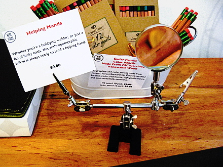 Linda Ziskind and the graphic designer Millie Rossman Kidd, editor of Dinner Where?, have created a pop-up shop for the season that actually comes off as "a curated collection" of artful and useful things, many at substantially below their normal retail prices. Case in point: Helping Hands, $9 at Here Today, 12 Main Street