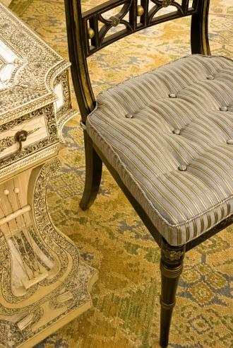 BOOKS Jeffrey Bilhuber’s Defining Luxury (Rizzoli 2008) is a veritable catalog of upholstery details and curtains. The book seems more about the chairs than the rooms – but that works for us! For example, the dining chairs on page 120 have leather seats, beige linen backs, green linen anti-macassars and nail heads. So, pick your poison! But do pick… Life, even for the rich, should not be an all-you-can-eat buffet. Restraint.