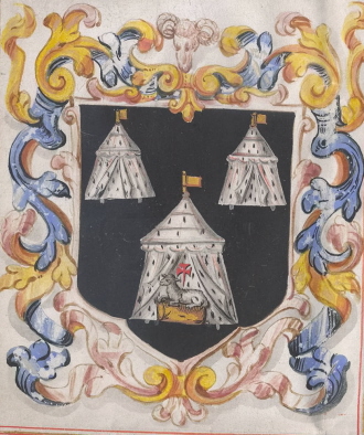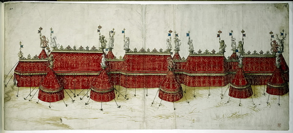 I Wikipedia’d ‘upholstery’ – a first step. And learn about Henry the Upholder, 14th century upholsterer, and the guild with its tent motif (left). Tents – how obvious. So I think, wasn’t it Henry the VIII with the great tents? Double click and voila – The Field of Cloth of Gold (below), the legendary tent city for the meeting of Francis I and Henry VIII in 1520.