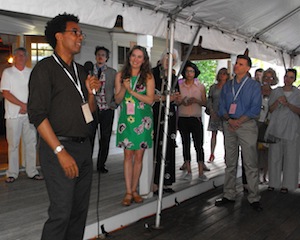 Fiona Breslin reports from Wassaic. It's a fact that every year Wassaic Project parties bring in one of the youngest and most merry crowds of any party across the region. This was the case on Saturday, June 15, as the project kicked off summer with more than 200 guests for its most important fundraiser of the year. A summer exhibition, Homeward Found, and art preview party held at the Maxon Mills, raised funding for education programs and keeping the project's summer festival free to the public. The night was jam-packed with guests including senator Terry Gipson who spoke in support of the Wassaic Project, and Rick Lowe (pictured above), founder of Project Row Houses, in Houston’s northern Third Ward. Lowe spoke about creative placemaking, a new catchphrase that describes when public, private, non-profit, and community sectors partner to shape the qualities of a neighborhood around art and cultural activities. The night also included delicious food provided by ten local restaurants, handmade cocktails infused with lavender and mint, live music and, of course, art. Homeward Found will be open Saturdays and Sundays through Labor Day.
