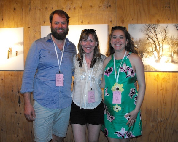 Executive directors Jeff Barnett-Winsby, Bowie Zunino, and Eve Biddle in front of work by Barnett-Winsby.