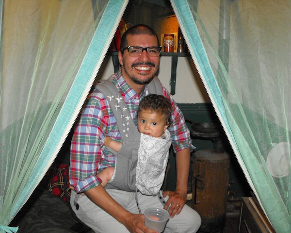 John C. Gonzales, an artist in the show (Stick Exchange, 2013), sitting with his son Orion, in Cabin Tent by Kevin Cyr, 2011.