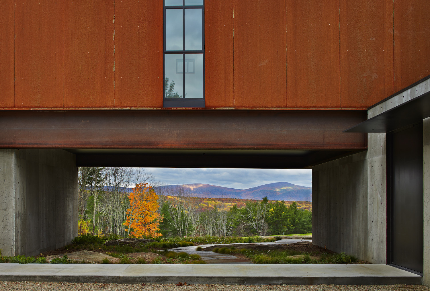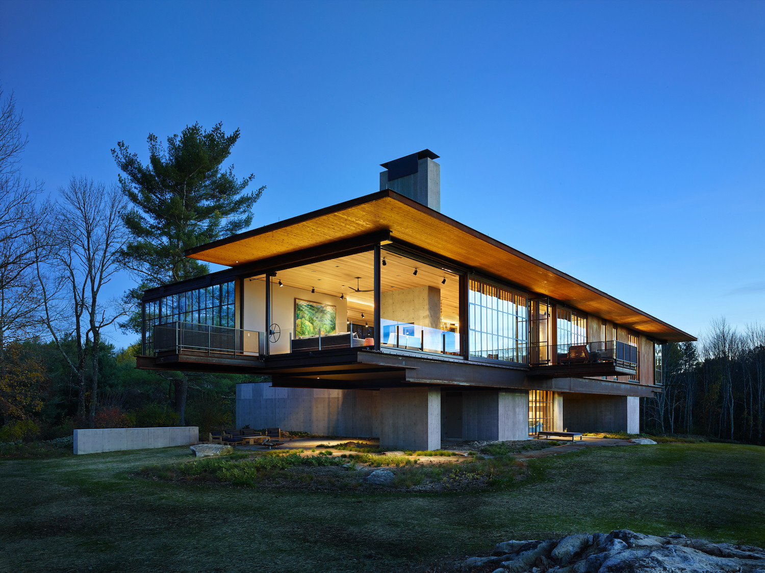 Kundig intentionally situated the house in an ecotone—the border between two adjacent ecological systems—stretching its design along the line where the forest meets the meadow. The building is thin enough that each room, as you move through the house, balances a feeling of interior refuge against the grand contrast of its surrounding vistas of the Berkshire Hills and Taconic Mountains.