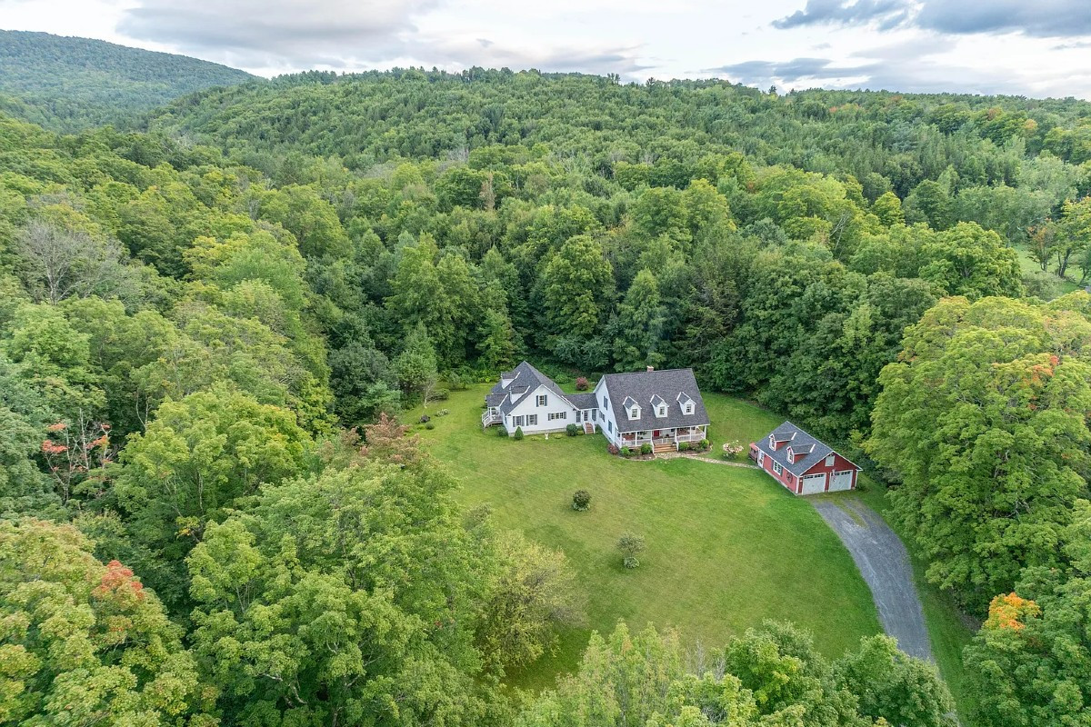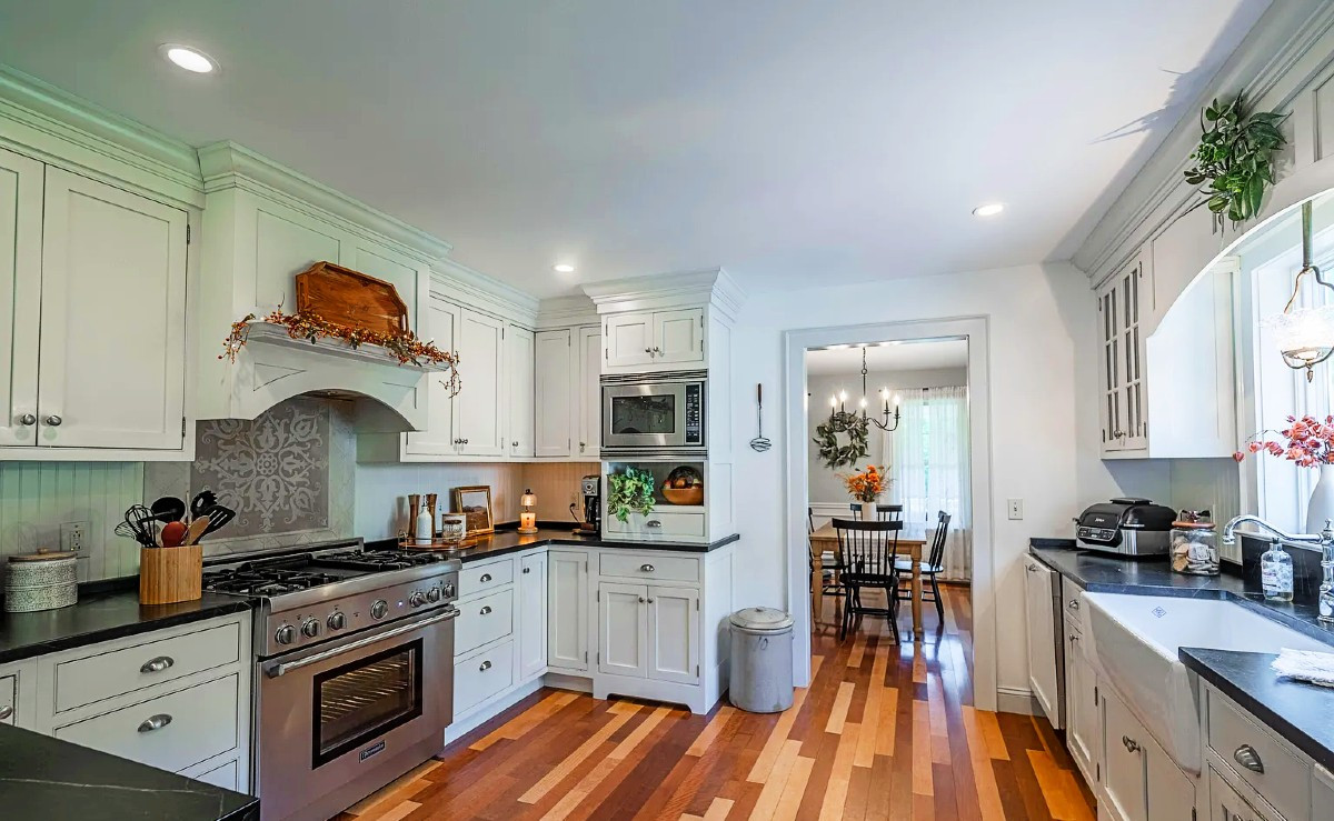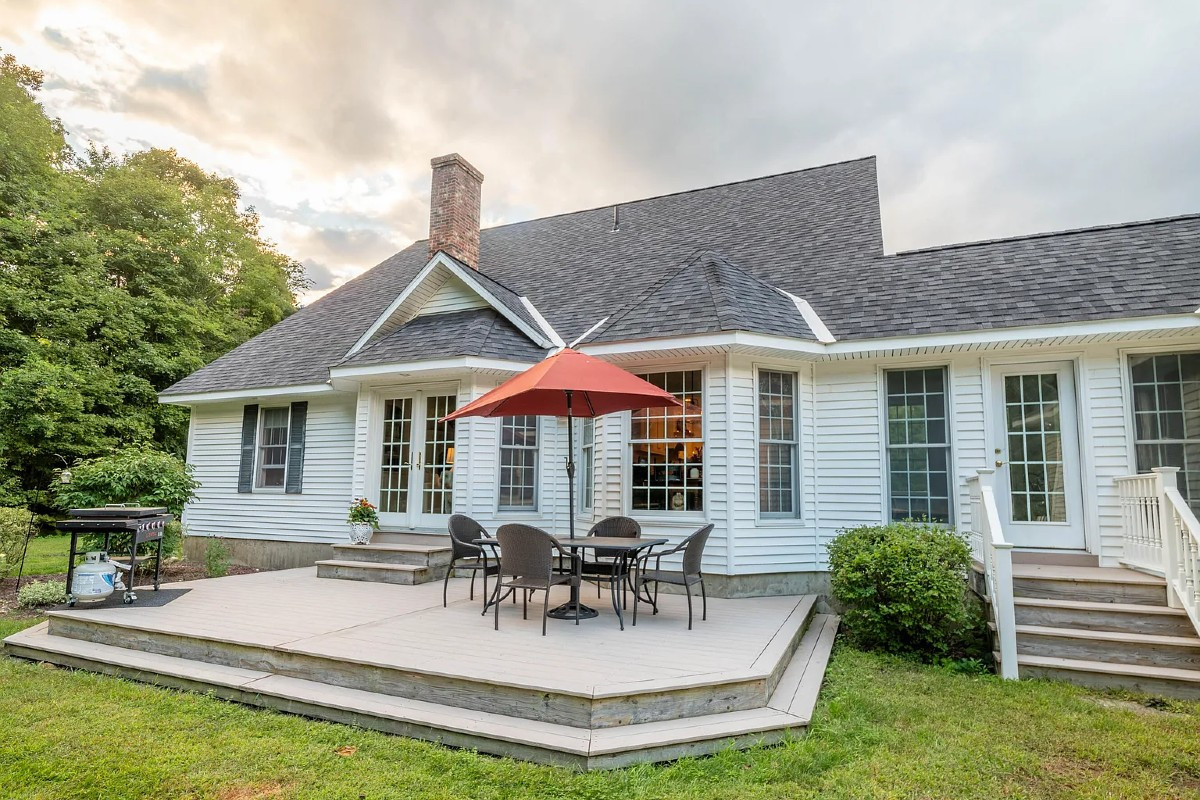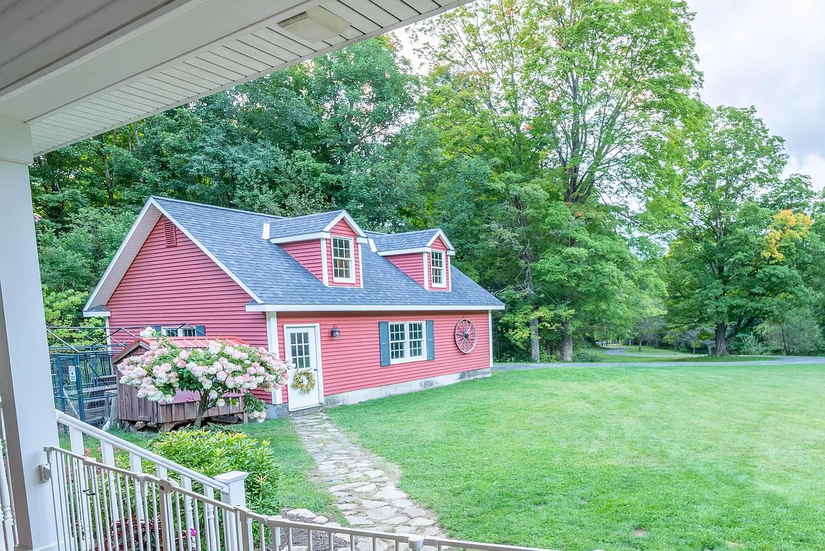 Sited alongside a brook, this five-bedroom, four-bathroom home in Adams features an expansive front porch. Custom details include a fireplace, gourmet kitchen with soapstone counters, hardwood flooring and curated fixtures. The backyard also features a large deck. The bonus in-law home includes a full kitchen, spacious bathroom with laundry, open living and dining room, sunroom, and two bedrooms. Listed at $899,000 by Home Sweet Home Real Estate.