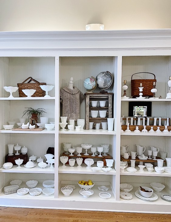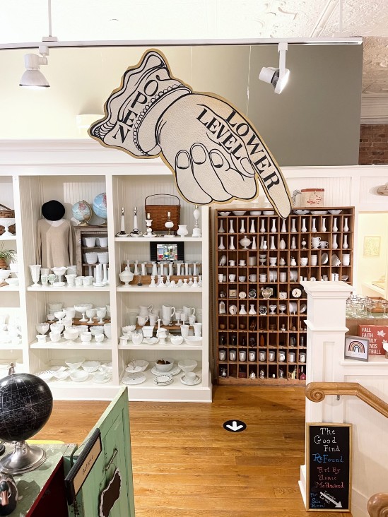 “On my days off, I still love to thrift. I’m just obsessed,” Lacey says. “I don’t have any clothing that wasn’t thrifted. I love housewares. If something makes me smile or makes me happy, like milk glass, or something I think other people might like, I stock it.”