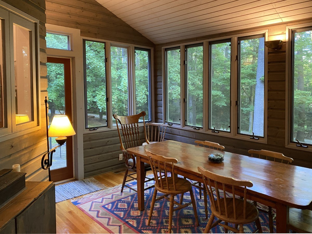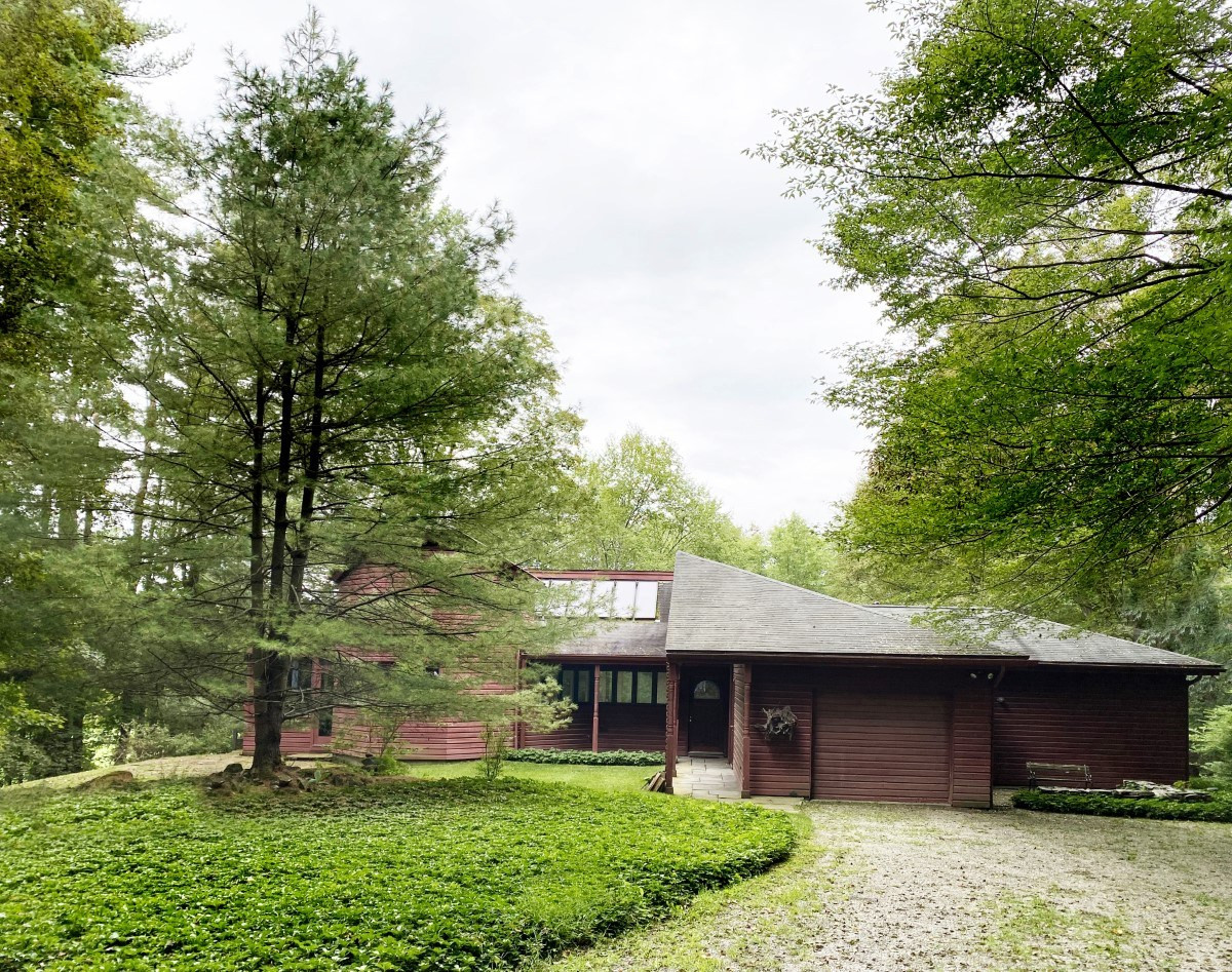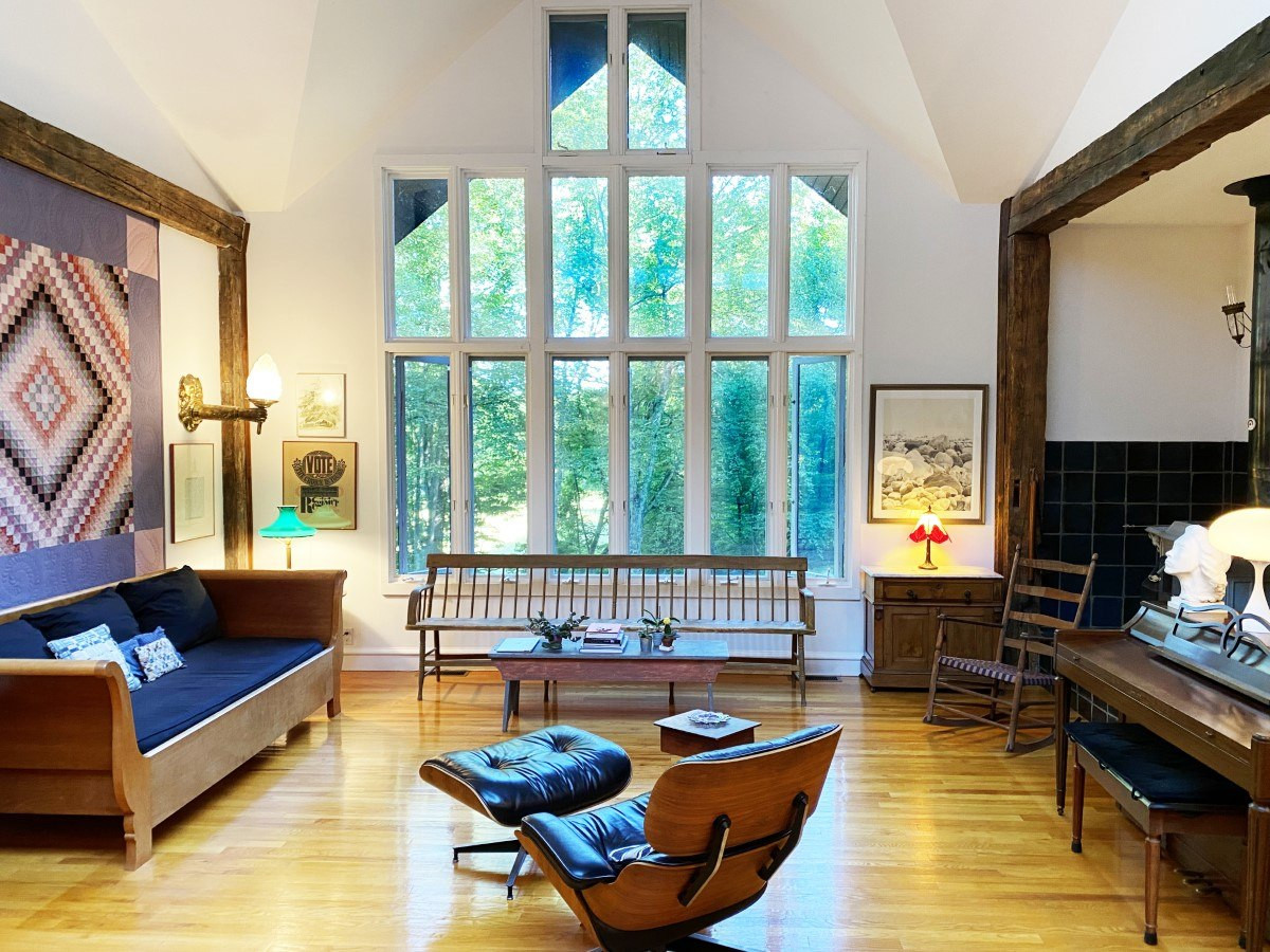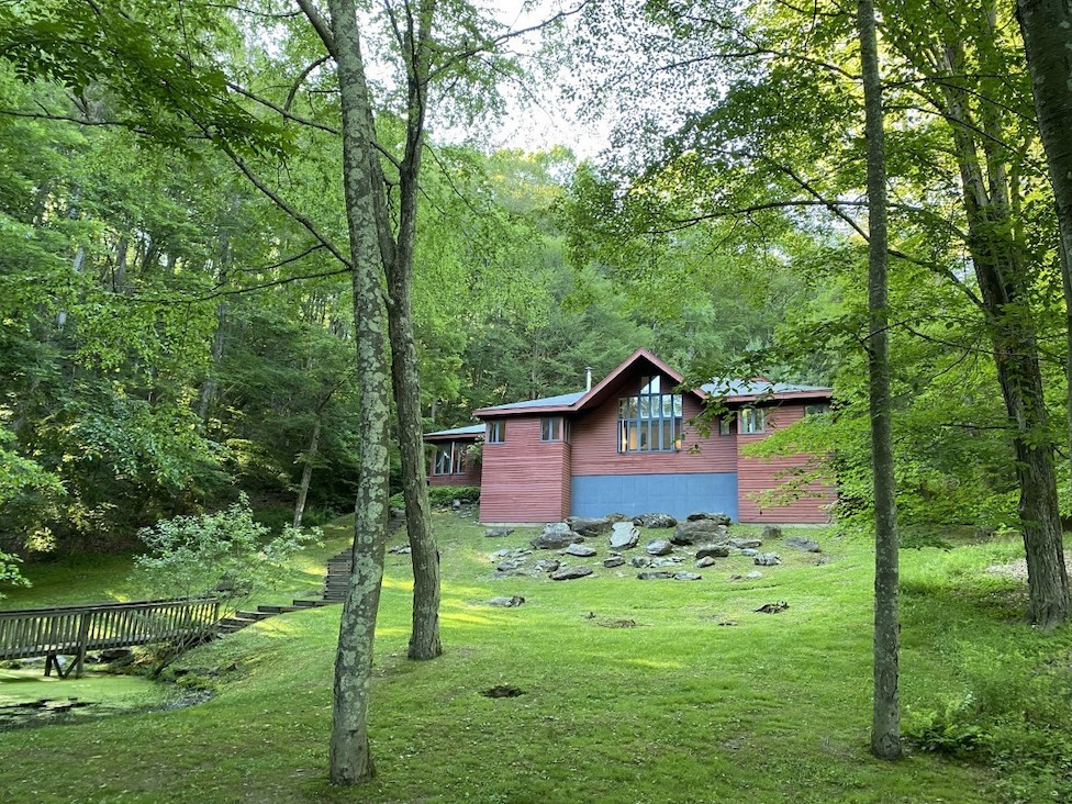 The approach to this home in Amenia is through an open meadow. The single-level house has three bedrooms and two bathrooms, soaring ceilings, an open floorplan, and a pond on nearly eight acres. There is a garage, two stone terraces and garden steps to the spring-fed pond. Listed at $850,000 by Elyse Harney Real Estate.