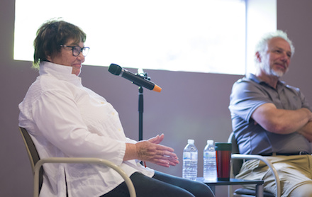 Packer and Epstein in a radio interview in 2016. Photo: Ava G. Lindenmaier.