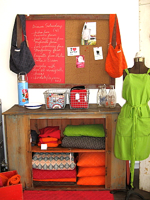 But again, no bitterness. "Every day, I think how fortunate we were to own a nice house on the river that we could sell to cover the bills. And we sold it just in time, before the market went down. We actually feel lucky. Now we are ready for the next adventure." These days the family lives in a rental, and Jill often brings their youngest (left) to the store. A retailing natural, she greets customers with, "Hi, I'm Stella." Jill's earlier retailing experience has helped her in this venture, of course, but just as valuable is her intuitive feel for the community, of which she is a longstanding member. She knows, for example, that while young women her age love flea market stuff (and believe it to be their civic duty to recycle everything, including home furnishings), they prefer to mix all that battered softness with bolder, more clean-lined and hard-edged modern design. The new Tivoli Mercantile captures the look.