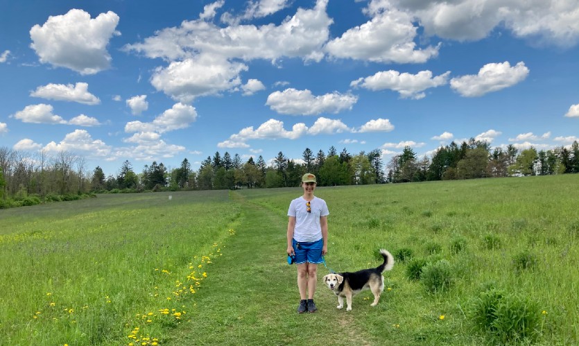 The author and her beagle/corgi mix, Dweezil, at Topsmead State Forest.