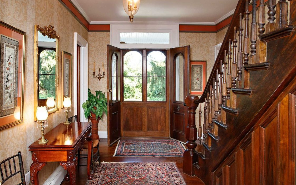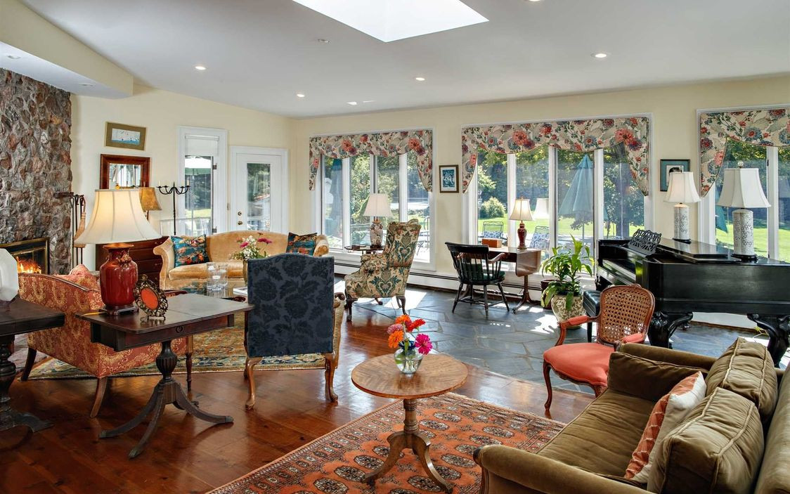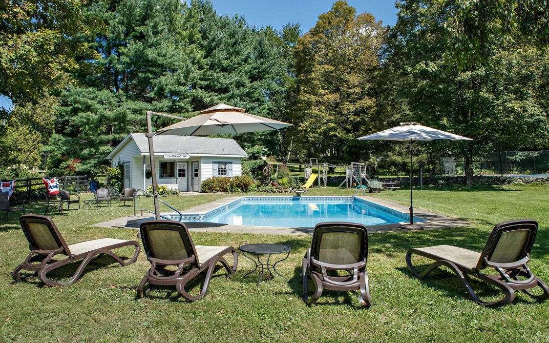 Built in 1982, this Colonial in Lagrangeville has 4,628 square feet on three acres. There are five bedrooms and five bathrooms,an updated chef's kitchen, oversized dining room, and a library with fireplace. The setting is picturesque, offering two ponds, mature landscaping and gardens, plus a pool, pool house, and tennis court with gazebo. Listed at $895,000 by Houlihan Lawrence.