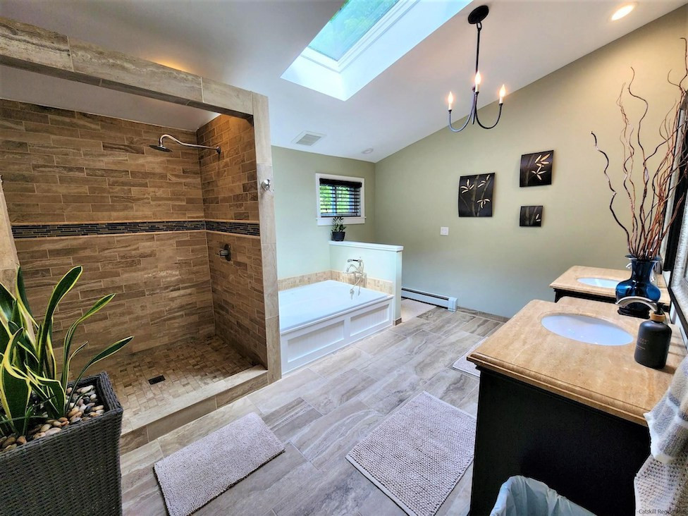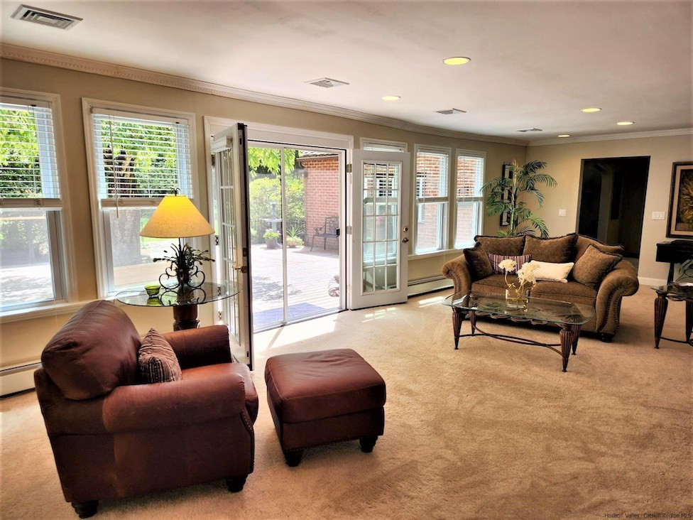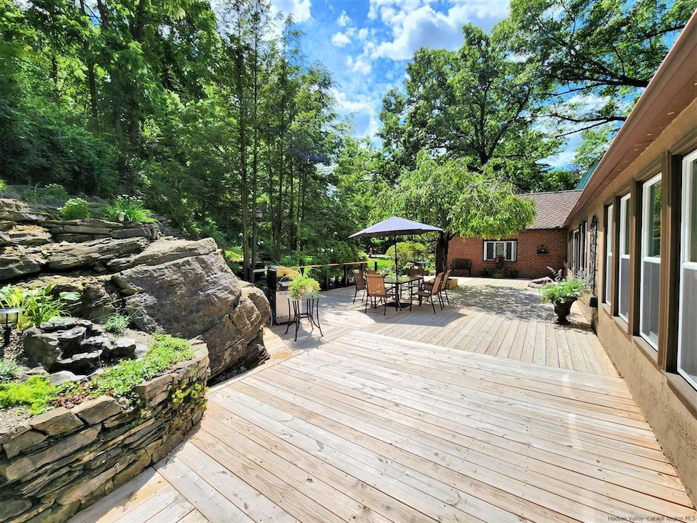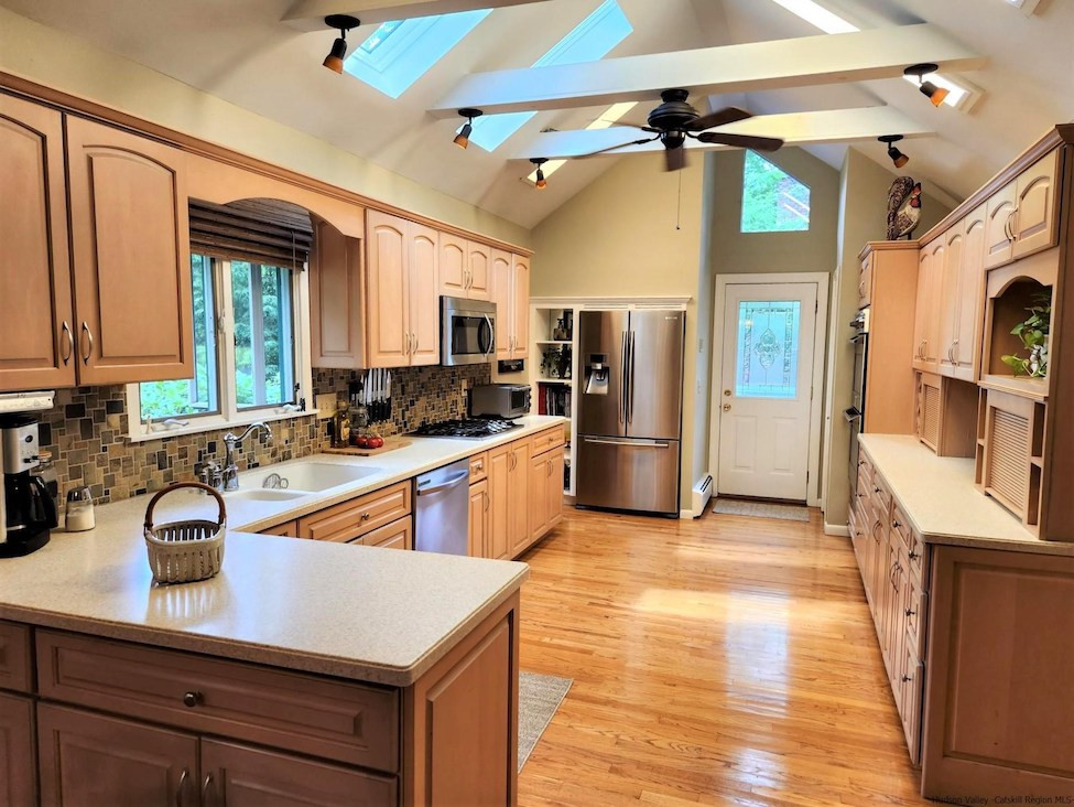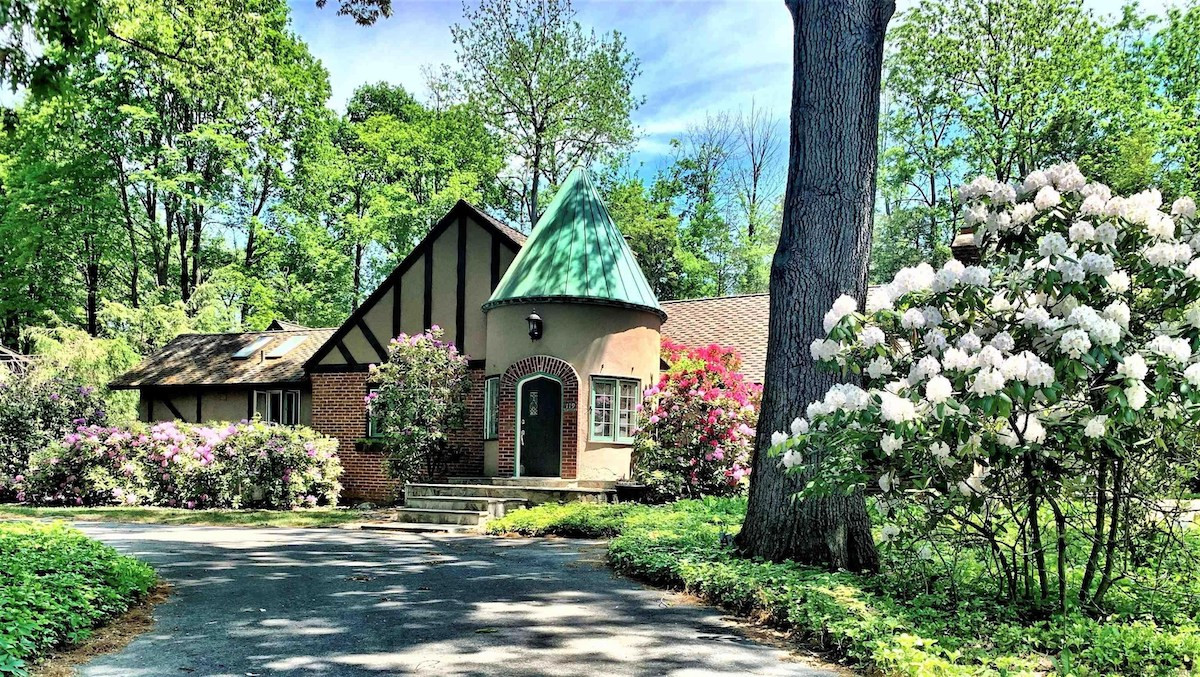 In Poughkeepsie, a striking 4,687-square-foot Tudor home is highlighted by a meticulously manicured front yard. It offers a circular foyer (capped by a copper turret), four bedrooms and five bathrooms, gourmet kitchen, spacious living room, family room with stone fireplace, and a gym downstairs that can be used as an additional bedroom. Outside is an expansive deck, designed gardens and circular driveway. Listed at $995,000 by Berkshire Hathaway Homeservices Nutshell Realty.