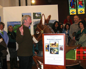 Lisa Green reports from South Lee. Master storyteller Kevin O’Hara may have documented his 1979 trek through Ireland in Last of the Donkey Pilgrims, but it was hardly the last adventure he’s taken, as illustrated by four local artists who captured their recent tour of the Emerald Isle with Kevin. The exhibit, “Travels With Missie — The Artists’ View" opened on Saturday, March 14 at the St. Francis Gallery with a wall-to-wall crowd of friends and art lovers. “You couldn’t handpick four artists and be more pleased than I am," O’Hara said of the creative quartet who decided to put on a show of their Ireland impressions while they were abroad. Above, O’Hara stands next to Missie, the Berkshire Carousel Donkey as he regales the crowd with yet another hilarious account of his original Missie sojourn.