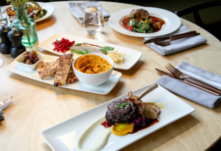 Chef Marcel Agnez has assembled an elegant, seasonally influenced, farm-to-table menu that makes decisions difficult for the diner. The scallops or the black bass? The venison chop or the roasted chicken with braised endive? A vegetarian delight, an enticing pasta dish or one of the specials? On days of operation (Thursday through Sunday) breakfast and lunch are offered, as well as a Sunday brunch. For dinner, starters range from fresh oysters with a blood orange granita ($3 each) to a refreshing Belgian endive salad with candied pecans, blue cheese and poached pears ($13). For a warm-up during colder months, there’s a savory baked oyster and leek chowder ($11).